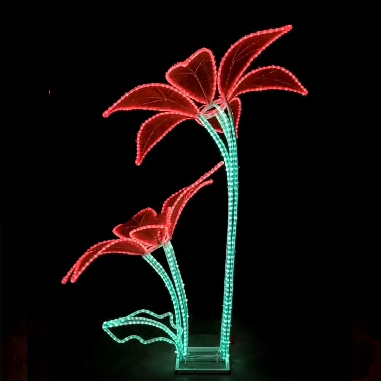 Elevate your outdoor decor with our stunning giant 3D LED flower motif light, crafted with high-quality LED rope lights for vibrant, eye-catching illumination. Featuring a bold red flower design paired with green LED stems, this light is perfect for Christmas, weddings, garden landscapes, and commercial event decor.